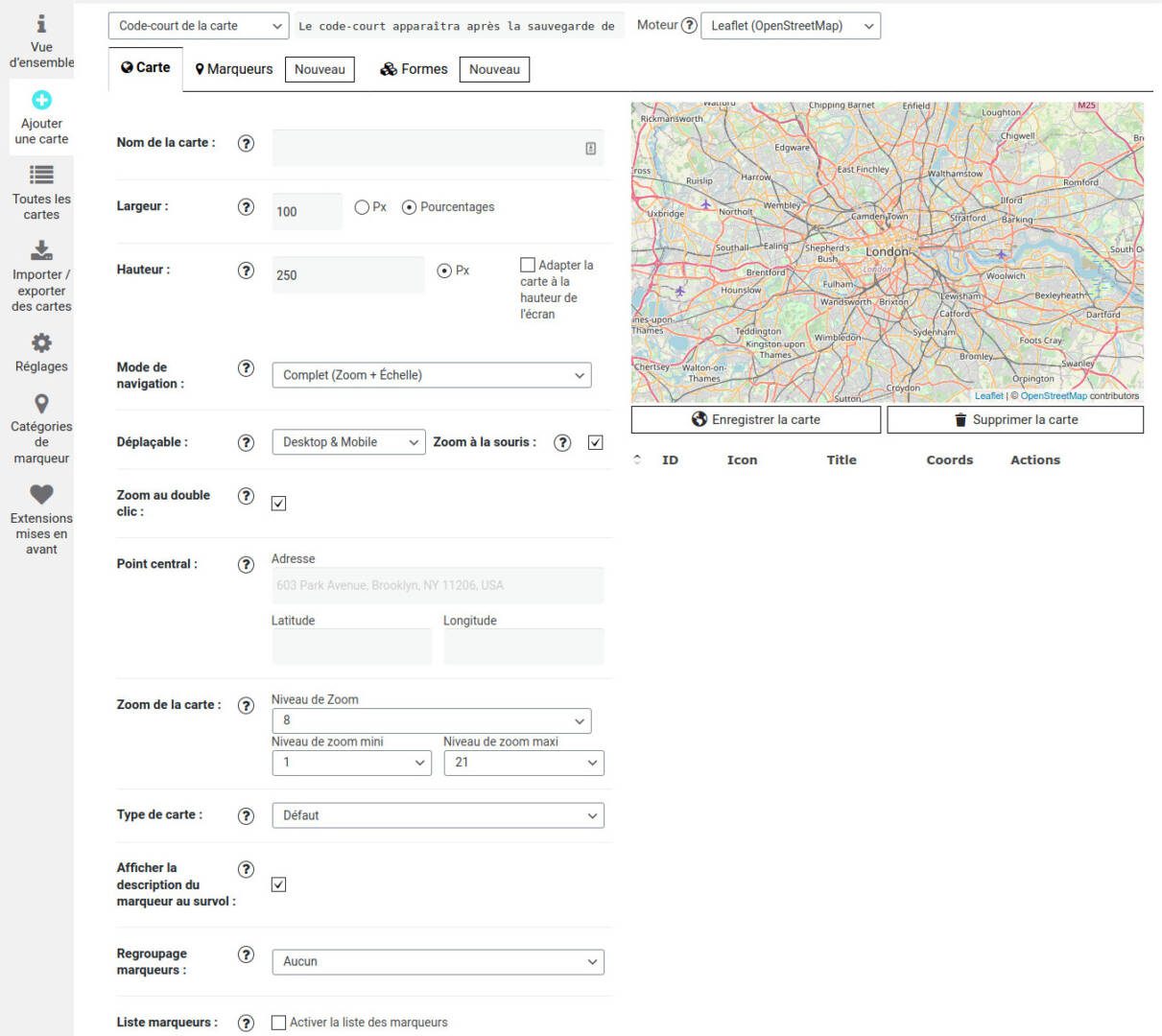 A noter qu’il est possible d’utiliser d’autres moteurs de cartes que OpenStreetMap : Bing maps, Leaflet maps, Mapbox et Thunderforest.