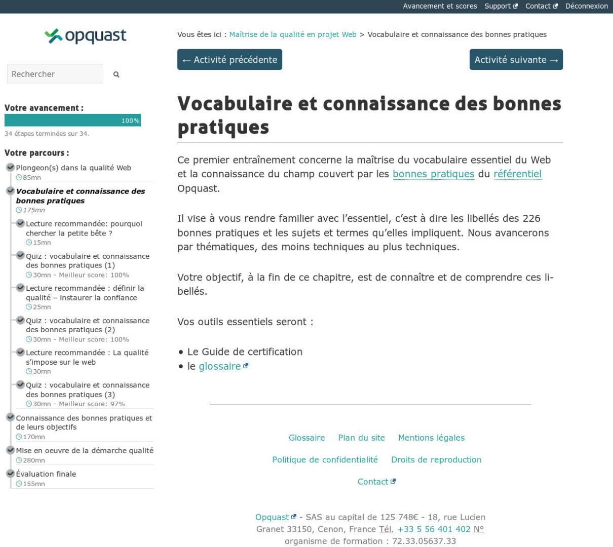 Les cours sont fait d’articles, de vidéos et de quiz. Le « Guide de certification », version allégée du livre « Qualité Web » est mise à disposition en version PDF ainsi que le glossaire.